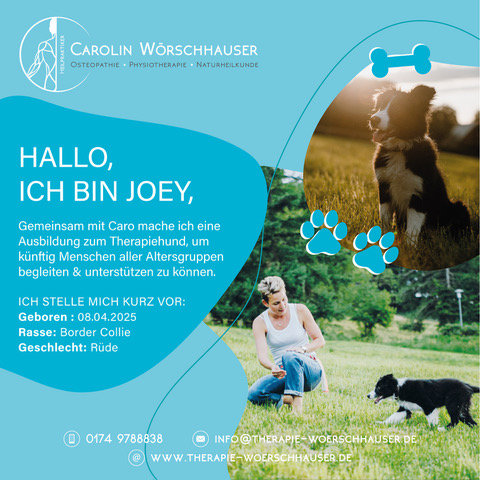 Ich bin Joey, ich bin ein junger Rüde, geboren am 8. April 2025. Seit Kurzem begleite ich Caro in ihrer Praxis und darf dort erste Eindrücke sammeln. Gemeinsam mit ihr erlebe ich den Praxisalltag, beobachte, wie Menschen sich öffnen, wohlfühlen und kleine oder große Fortschritte machen. Ich bin ganz aufmerksam dabei – und bald darf ich sogar selbst mithelfen.